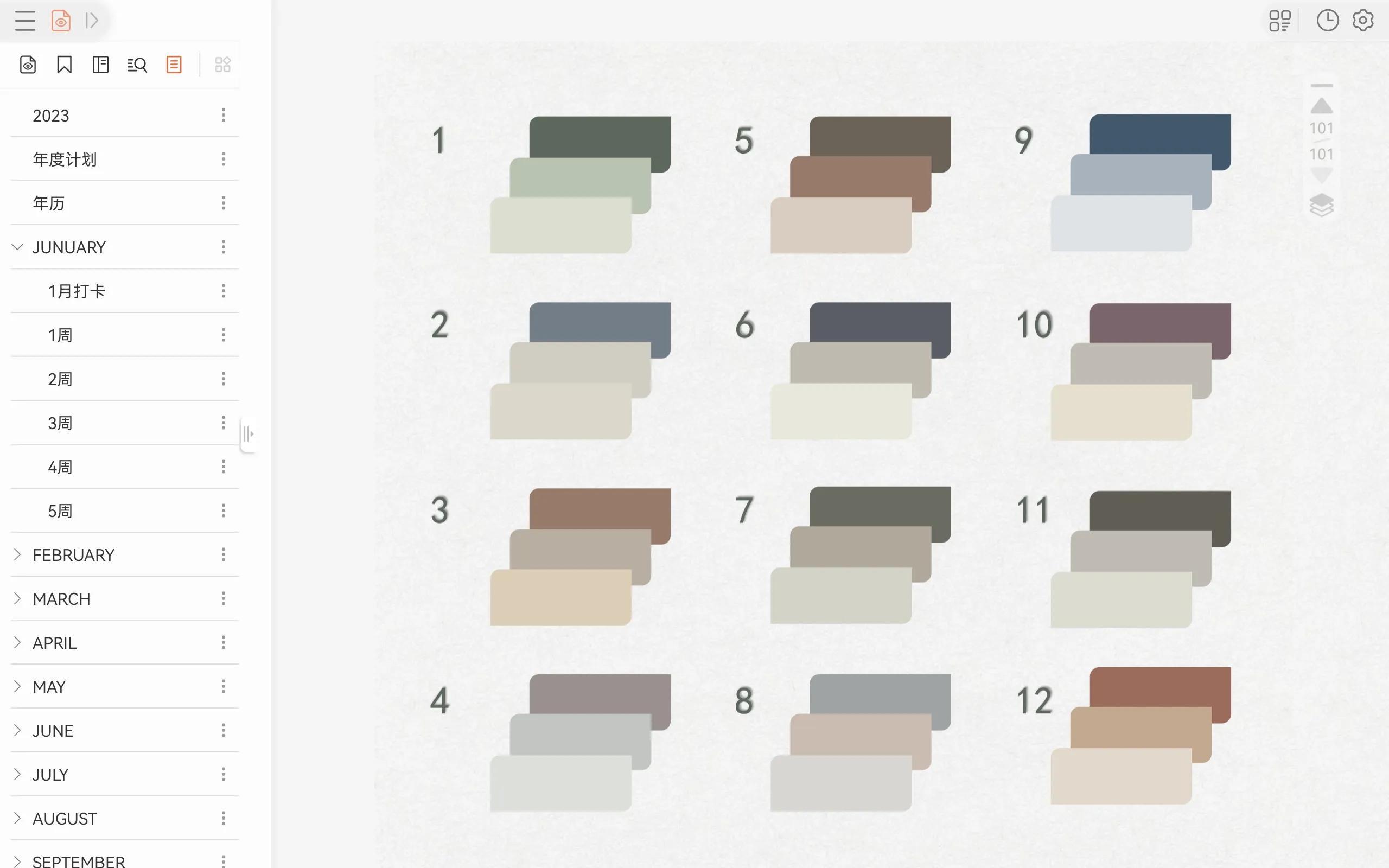 这就是我设计的2023年全年计划本,其实是比较简单的,我也是刚接触这种电子手帐,没有添加更多更复杂的功能,因为也算是23年的一个新尝试,从比较简单的开始,毕竟任何计划、方法都是为我们人服务的,如果做计划这件事变得有负担的话,就本末倒置了。
