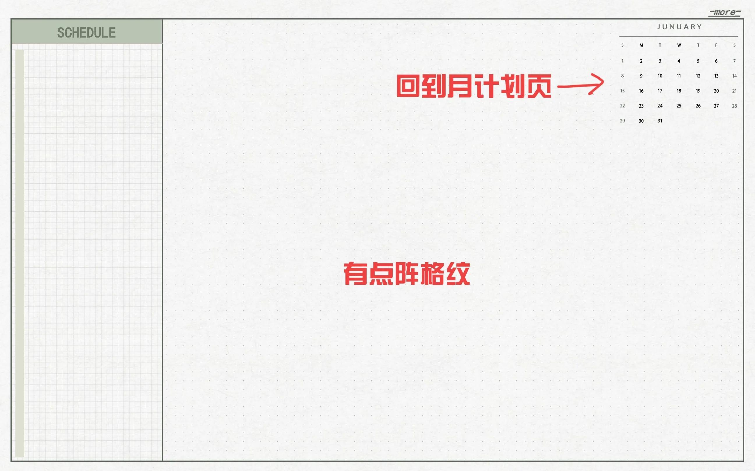 左边记录这一天的Schedule,右边可以用来写日记(有点阵格纹)。如果想写一个更详细的月度总结,用这一页也是可以的,我觉得用来做旅行计划,写游记也很合适。总之,根据需要使用就好,右上角的月历也是有超链接的,可以跳转到月计划页。因为这一页不是必须的,所以我只放了一页,大家需要用的时候同样在左边页面概览里复制模板就好。如果能添加超链接,再自己在周计划页或日计划页添加超链接跳转到这一页。