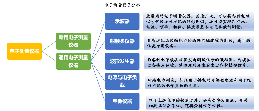 电子测量仪器可以分为专用电子测量仪器和通用电子测量仪器,市场以通用电子测量仪器为主。通用电子测量仪器主要包括示波器、射频类仪器、波形发生器、电源与电子负载、其他仪器等。