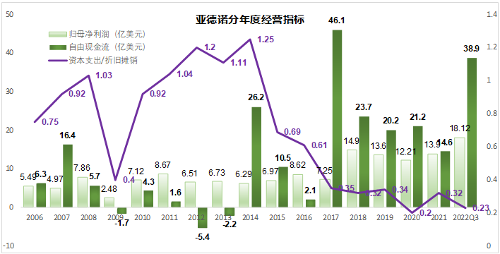 我们以ADC芯片行业高山仰止的龙头亚德诺为例。这个本该进行大量资本开支搞研发的企业,近年来也走上了无条件回报股东的不归路。自2014年以后,公司的资本支出与折旧摊销的比值就像断了线的风筝,2015年之前还能维持在1以上的水平,2015年以后则降到了0.4以下。与此同时,公司对股东越来越慷慨,这家公司过去一年的资本支出为5.26亿美元,但加上股息,公司向股东返还了60亿美元,相差10倍。