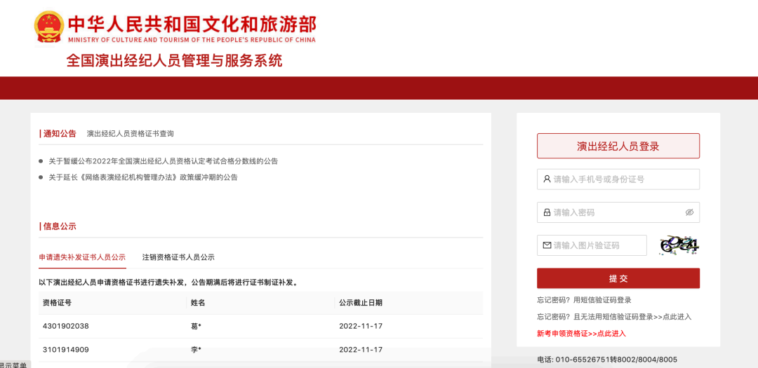 演出经纪人员从“全国演出经纪人员管理与服务系统入口”登录系统