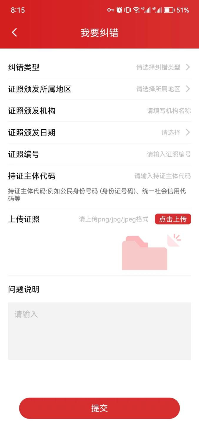 在申领/查看电子证照过程中发现照面信息错误,可点击“我要纠错”,填写纠错信息。