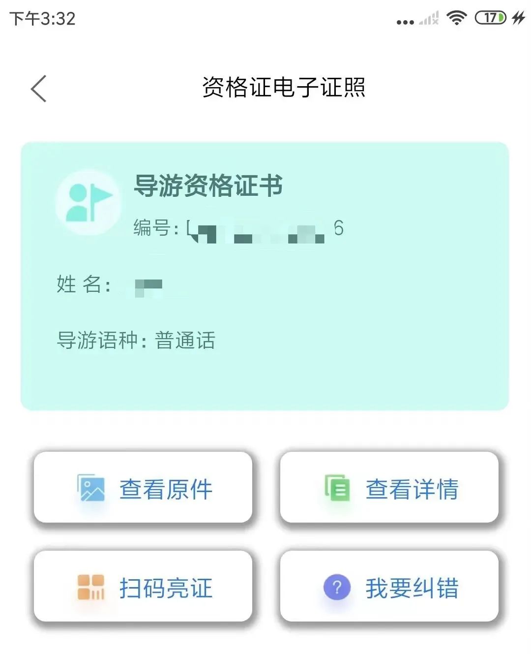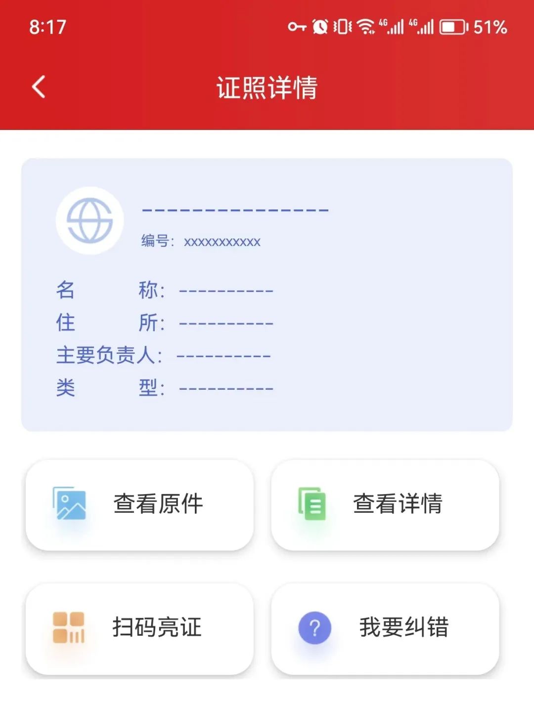 人脸识别通过后,进入证照详情页,有证照基本情况、查看原件、查看详情、扫码亮证、我要纠错等。