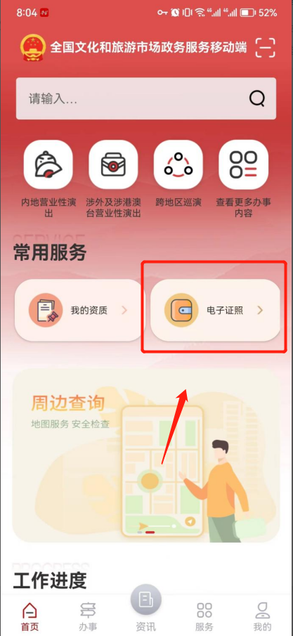 4、获取申领指南:在APP首页中点击办事,在办事指南中获得电子证照申领指南
