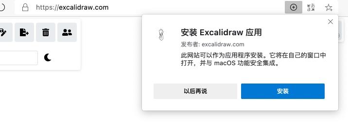 另外,Excalidraw 除了打开网站使用,也支持通过点击浏览器地址栏的“加号”图标来添加应用,这样在 Windows 的开始菜单和 macOS 的启动台中就有了 Excalidraw 的应用,便于快速启动,这是接近“软件式”的体验。