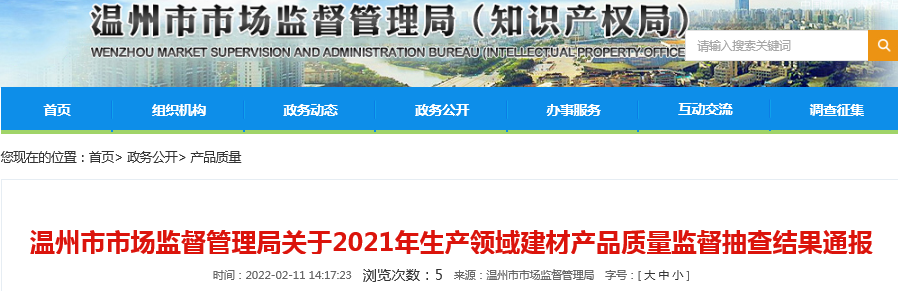 中国质量新闻网讯 2022年2月11日,浙江省温州市市场监督管理局网站发布关于2021年生产领域建材产品质量监督抽查结果通报。