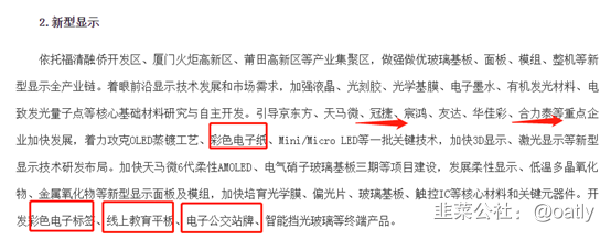在福建省“十四五”制造业高质量发展专项规划的通知更是明确指出,引导京东方、天马微、冠捷 、宸鸿、友达、华佳彩、合力泰 等重点企业加快发展,着力攻克彩色电子纸 等一批关键技术。开发彩色电子标签、线上教育平板、电子公交站牌、智能挡光玻璃 等终端产品。