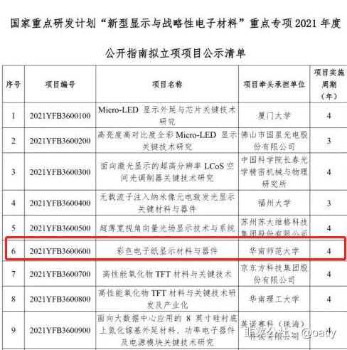 2021年底,科技部国家科技管理信息系统公共服务平台发布了“新型显示与战略性电子材料”重点专项2021年度拟立项项目信息,公示项目为22项。其中就包含有华南师范大学牵头的彩色电子纸项目。