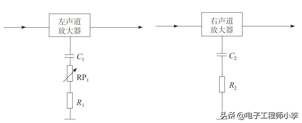 在右声道电路中,R2的阻值确定,使右声道放大器增益固定。以右声道放大器增益为基准,改变RP1阻值,使左声道放大器的增益等于右声道放大器的增益,就能实现左、右声道放大器的增益相等。