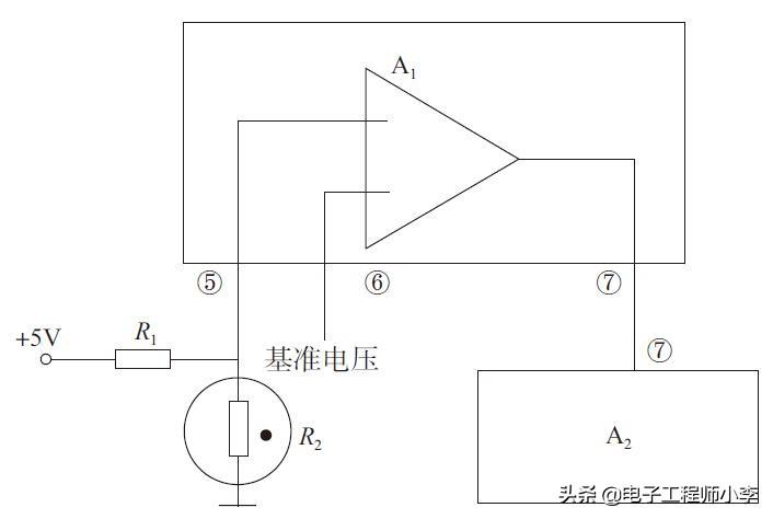 电压比较器集成电路:当A1的⑤脚直流电压大于⑥脚直流电压时,⑦脚输出高电平给集成电路A2的⑦脚。当A1的⑤脚直流电压低于⑥脚直流电压时,⑦脚输出低电平给集成电路A2的⑦脚。由此可知,集成电路A1的⑦脚输出状态由⑤脚和⑥脚之间的相对电压高低决定。