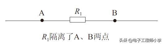 如图3-34所示,是典型电阻隔离电路,电路中电阻R1将电路中A、B两点隔离,使两点的电压大小不等,但是这两点之间还是通路,而这样的电路就称为隔离电路,这种情况也是最简单的隔离电路。