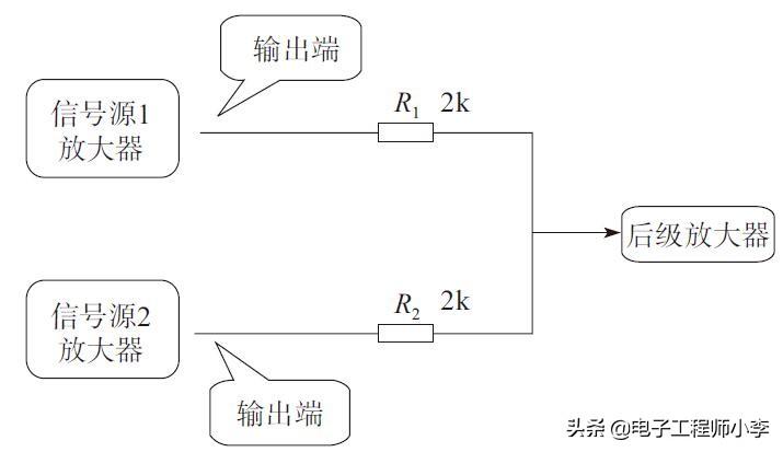 加了隔离电阻R1和R2后,两个信号源放大器的输出端之间就被隔离开,两个信号源放大器输出的信号电流可以不流入对方的放大器输出端,而更好地流到后级放大器输入端,实现电路的隔离作用,这样两个信号源放大器之间就不会相互影响。
