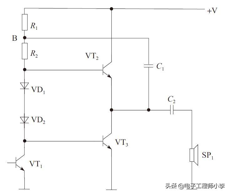 电路中,R1用来将B点的直流电压与直流工作电压+V隔离,使B点直流电压有可能在某瞬间超过+V。