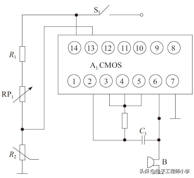 接通电源后,S1接通,电路进入工作状态。当水温较低时,热敏电阻器R2阻值较小,集成电路A1的⑩脚上直流电压较低,不足以使集成电路A1内部的振荡器工作,此时蜂鸣器B不工作。