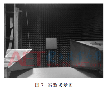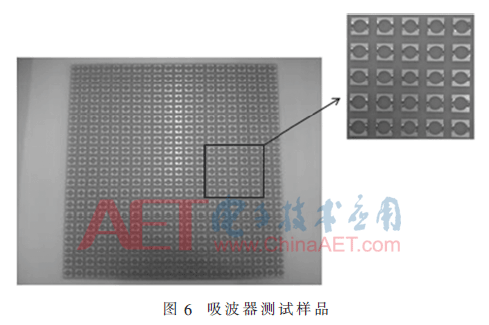 为了验证吸波器的吸波效果,依照经过CST仿真优化过的结构参数加工出有限单元大小的吸波器实验样品,尺寸为284 mm×284 mm,一共有20×20个单元结构,如图6所示。实验样品采用有损耗的FR-4介质基板,厚度为3 mm,介电常数为ε=4.3。表面金属环和背板均采用金属铜,厚度为0.035 mm,电导率为σ=5.8×107S/m。加载的集总电阻采用0603封装的贴片电阻,阻值为r=270 Ω,尺寸为1.6 mm×0.8 mm×0.4 mm,正好契合金属环开口大小,方便焊接。在微波暗室中,采用自由空间测试法,如图7所示,使用Agilent N5244A矢量网络分析仪,输出端连接一个1~18 GHz的宽带双脊喇叭天线,输入端分别连接6~8 GHz、8~12 GHz、12~14 GHz的矩形喇叭天线对实验样品进行测试。把待测的实验样品放置在微波暗室中间,收发天线对称放置,且与吸波器的法线夹角很小,可以忽略。测试结果如图8所示。