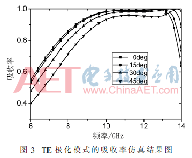 下面分析吸波器在斜入射条件下的吸收效果。图3所示为吸波器在TE极化模式(电场E方向保持不变,磁场H方向改变)下,吸收率变化的曲线。可以看出当入射角在不超过45°的范围内,90%吸波带宽变化不大,但是吸波带随着入射角的增大有明显的蓝移现象。这是因为随着入射电磁波角度的增大,入射波的磁场分量激励起的表面电流变小,电流路径变短,谐振点往高频移动,所以宏观表现为吸波带蓝移。当入射角达到45°时,整个吸波带内的吸收率下降开始加快。总体来说,吸波器对于45°内斜入射电磁波有着良好的吸波效果。