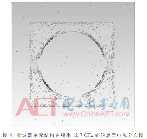 为了阐述宽带吸收效果产生的原理,对吸波器的表面电流分布进行分析。图4为吸波器吸收峰值频率 f=12.7 GHz处的吸波器表面电流分布,箭头方向代表电流的流向,箭头疏密程度反应了表面电流的大小。对于吸收峰值频率f=12.7 GHz处,可以看到在谐振时,金属环表面的感应电流要明显高于底板,这是因为入射波的电场分量在金属环上激起了电谐振。金属环上的感应电流和背板上的感应电流方向相反,形成了等效环流,这说明入射电磁波的磁场分量在金属环和底板之间产生了磁谐振,强烈的电磁谐振使得吸波器对入射波实现完美吸收。
