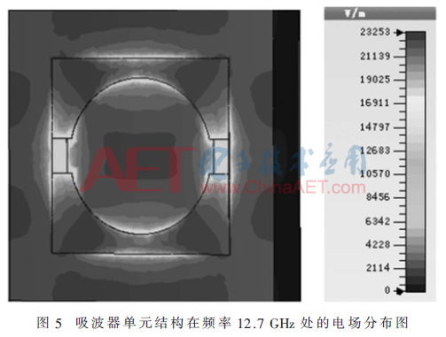 进一步分析电场的分布,如图5所示。电场分布表明,入射电磁波的电场分量与金属环产生了电偶极子响应,在外电场的驱动下,电场主要集中在金属环上。对于吸收峰值频率f=12.7 GHz处,金属环上下部分内外两侧存在少量能量损耗,而大部分能量在金属环开口处和加载的集总电阻上以金属损耗和欧姆损耗的形式被消耗掉。