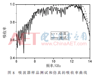根据实验结果可以看出,吸波器实验样品在频率 8.00~13.2 GHz 波段吸收率高于 90%。吸波带整体有一定的红移现象并且吸波峰值略低于仿真值,这可能是实验样品的加工存在误差和测试系统的精度不足导致的。此外,用20×20个单元结构模拟无限大周期结构也会对实测结果产生影响。
