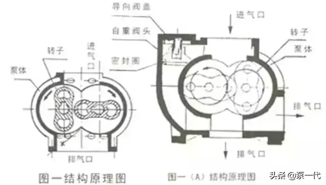 四对转子装在二根平行轴上,轴由上下两端轴承支撑,泵腔级与级之间有隔板,隔板上有吸排气通道。