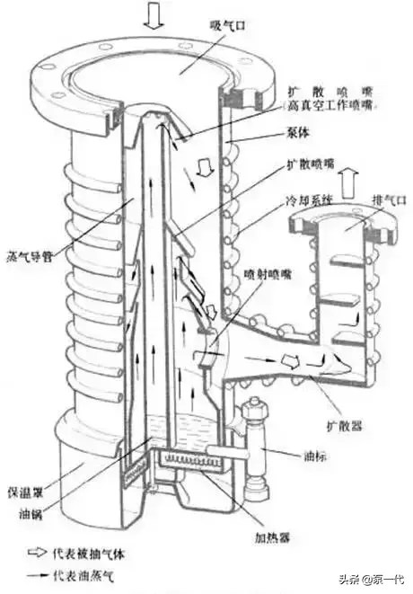 油扩散泵的返流。 气体分子的反扩散。 扩散泵油的裂化分解,一般扩散泵对其工作油的要求是饱和蒸气压以内(室温下0.00000001Pa左右),受热稳定性好,不易被氧化,分子量大的高沸点的液体,如硅油是扩散泵中比较理想的工作油。 泵清洗不干净,污染物质留在泵内并重复循环,影响其真空度。扩散泵是一种次级泵,它需要机械泵,目前,扩散泵是最广泛、最主要的获得高真空的工具之一 。作为前级泵。高真空扩散泵主要由泵体、冷却帽、喷嘴、蒸气导流管、加热器和冷却器等组成。