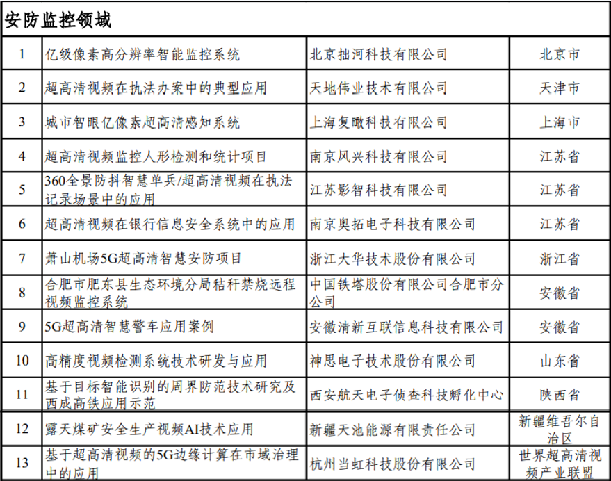 安防领域拟入选超高清视频典型应用案例名单