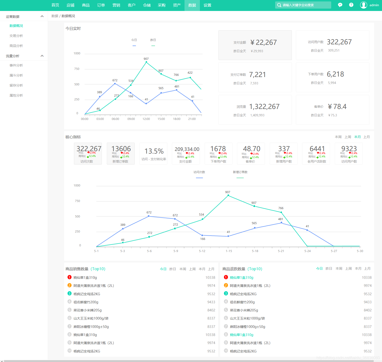 商品分析:统计各单品的销量、销售额、付款人数、支付转化率;统计各类目销量、销售额、各类目销售占比、各类目与上一统计周期的环比情况。