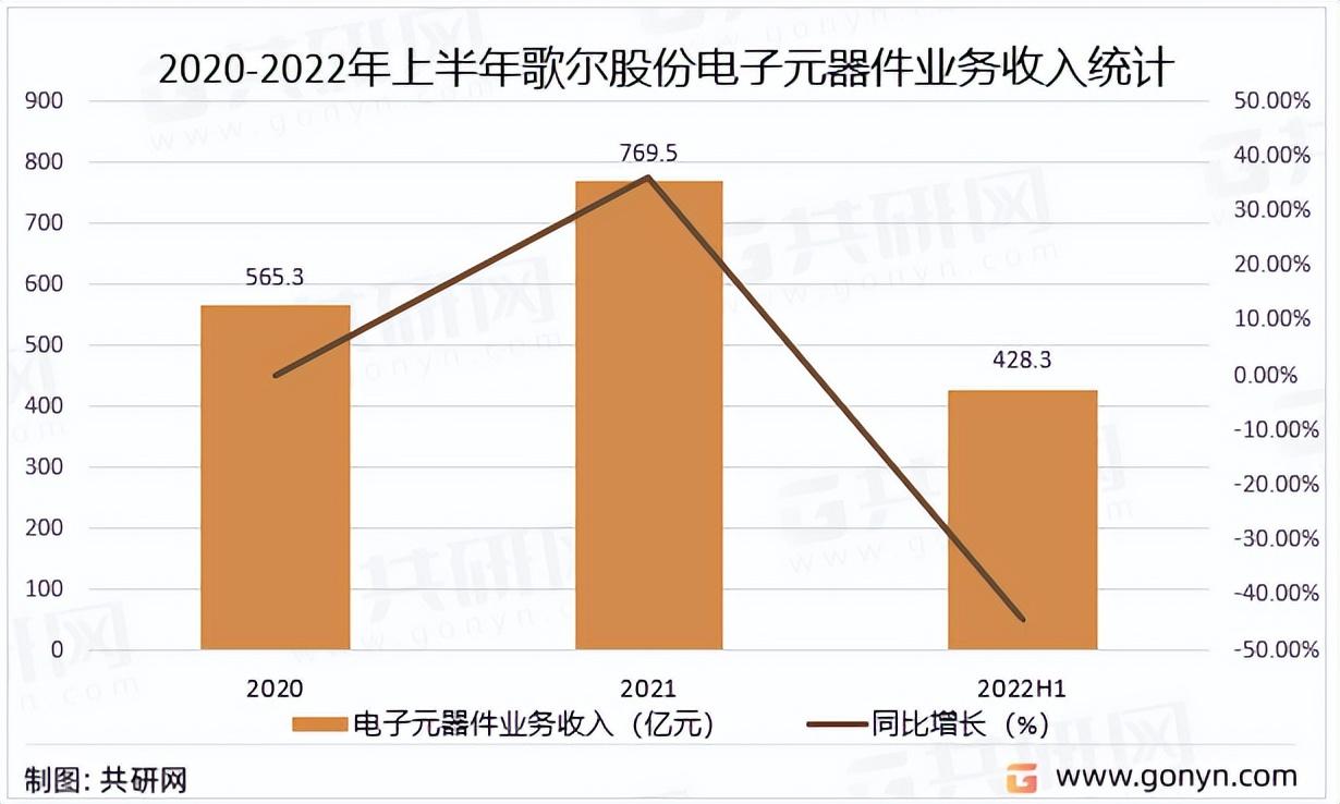 从电子元器件业务收入来看,2021年歌尔股份电子元器件业务收入完成769.5亿元,同比增长36.12%,2022年上半年歌尔股份电子元器件业务收入已完成428.3亿元。
