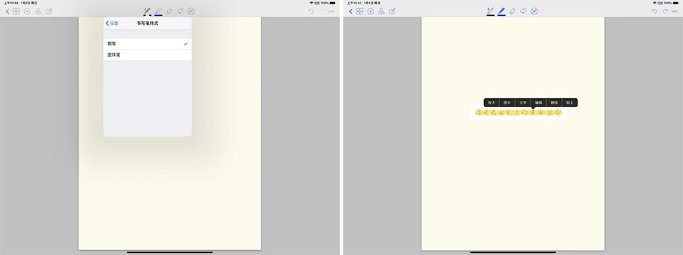 触控笔中支持不同的笔,最好用的当然是 Apple Pencil;压力敏感度就是笔迹会随着下笔力度改变粗细,我选择打开,这样写出来的字会更好看一些;双击动作可以自定义修改,默认为笔和橡皮之间切换。