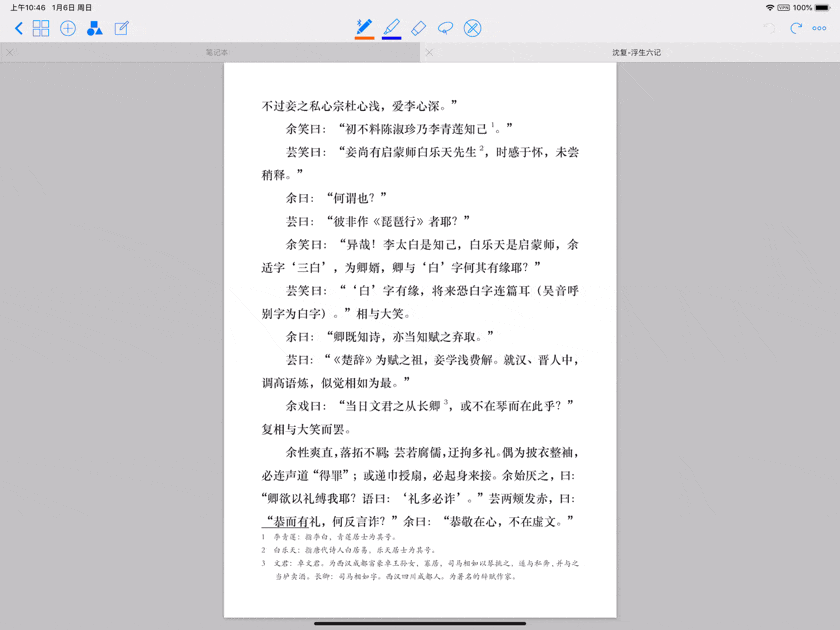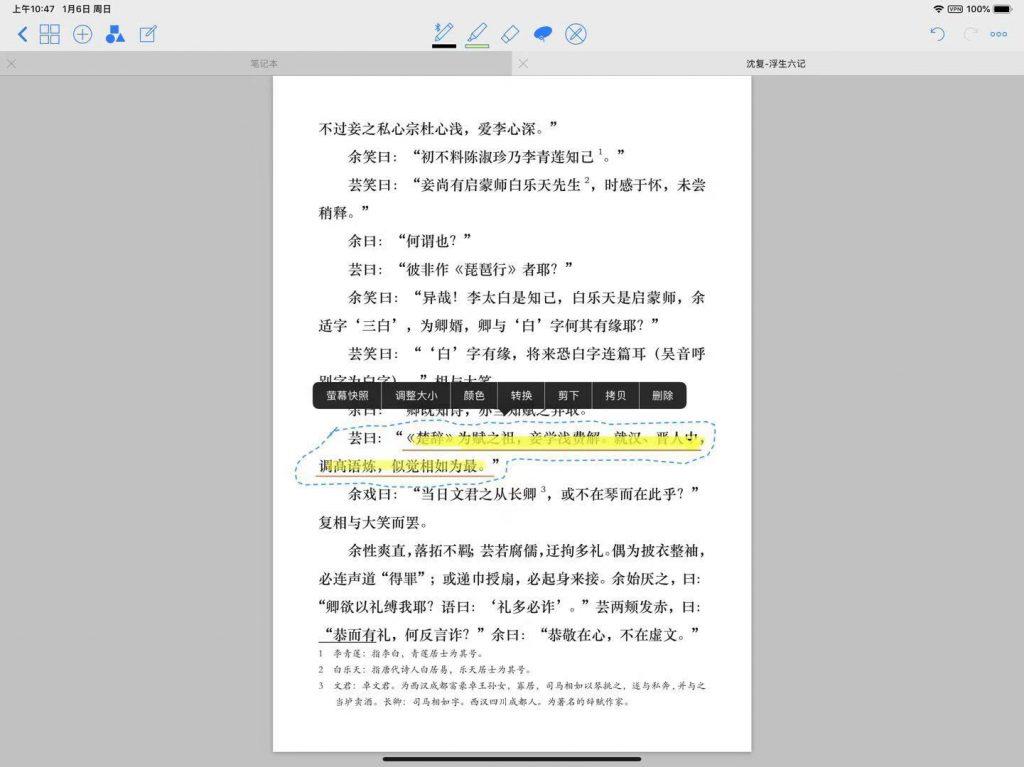 GoodNotes 还可以用作 PDF 阅读器,开启画图模式,标注的线会自动纠正为直线,对于有强迫症的我来说这个功能可谓十分贴心。还能用套索功能对文件中某一段话进行编辑或者保存。