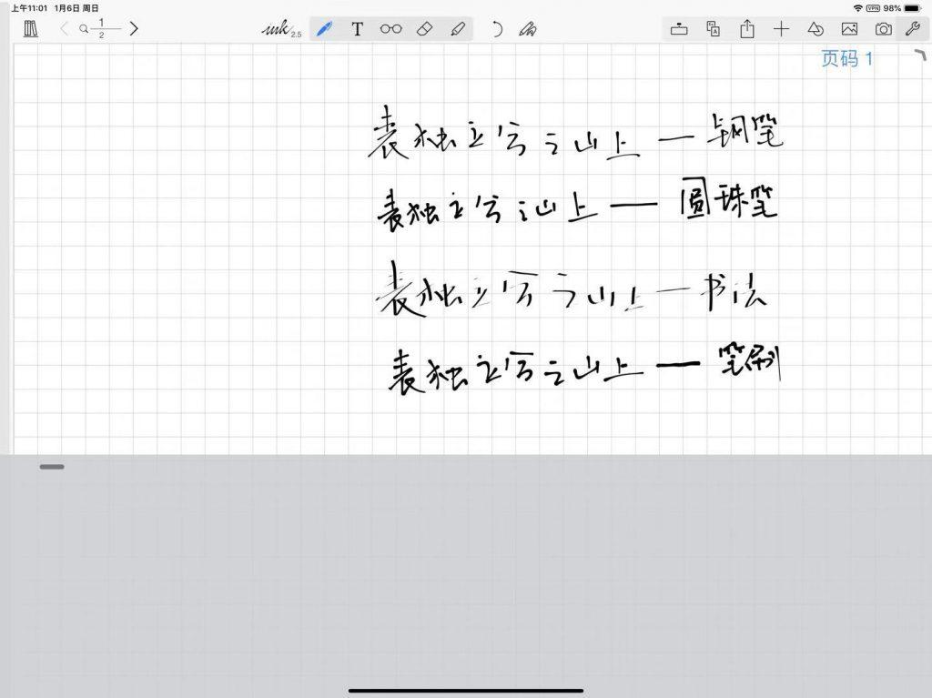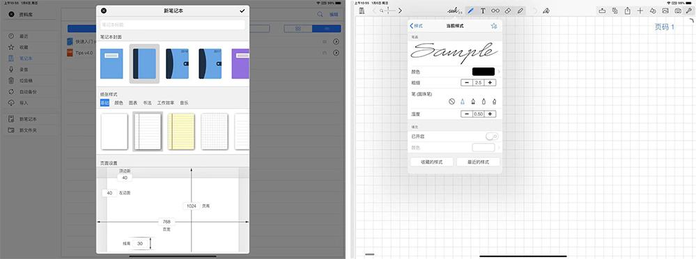 Notes Plus 作为老牌笔记应用功能十分全面,从最初的笔记选择页面就体现出一种精致的感觉,可选的封面和样式比较多样,另外可以自己设置页面的边距等;它同样有非常多的笔触可选,可以模拟钢笔、圆珠笔、毛笔书法等,能够根据下笔的力度、快慢显示不同的效果,比较贴近真实的笔触,书写体验很美妙。