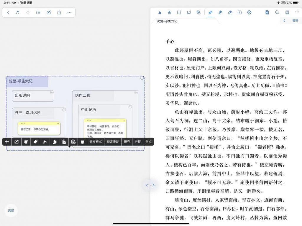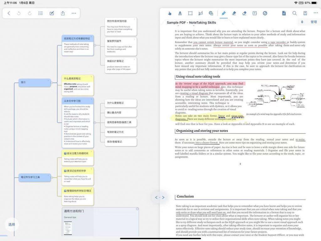 MarginNote 最独特的功能是脑图,这一点在学习笔记中尤为重要,大家都知道脑图能够梳理思路,学习过程中,可以将某一段单独摘录出来,点击学习按钮自动分屏,就可以自己画脑图啦,对于学生来说这个应用用于学习特别适合。
