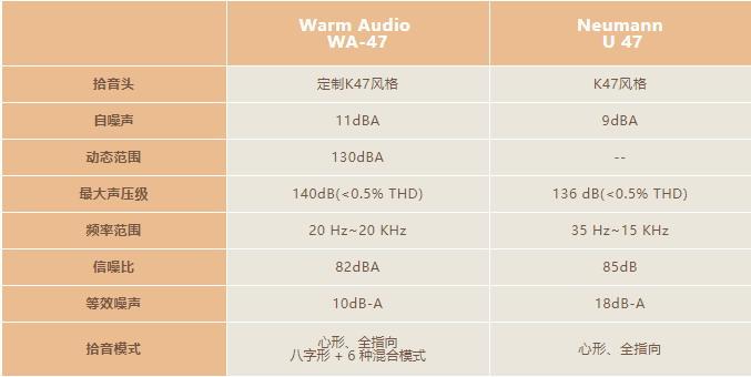 WA-47并没有完全去照搬Neumann U 47,而是加入了自己的一些改良。下表提供了两个麦克风的一些主要技术规格对比,从中可以看出它们之间的区别。