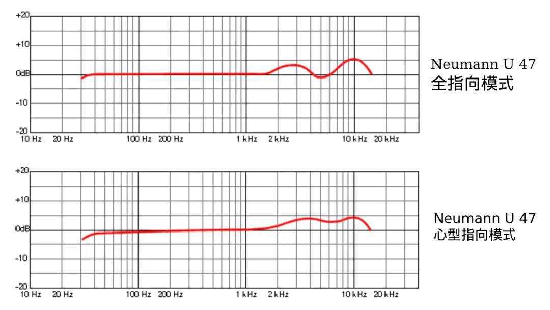 以下列出了Neumann U 47和Warm Audio WA-47不同拾音模式下的频响图,我们可以进行一个大致对比。Neumann U 47的频响有点夸张,真实性也无从考证,但这是能找到的资料。