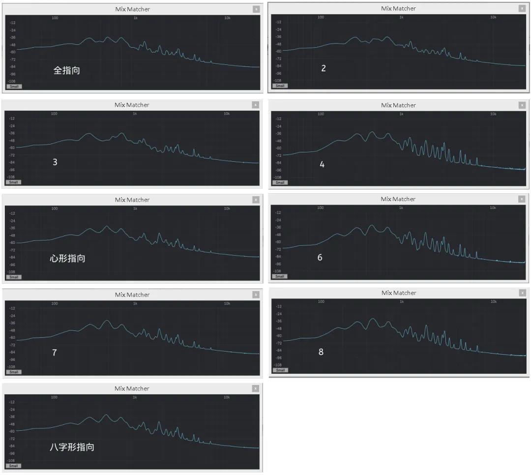 以上截图来自相同录音片段的相同时间节点,可以看出,9种录音模式并没有很明显的变化。与官方提供的频响图所描述的情况差不多,仅仅是某些频点附近有些许细微变化,非常微妙。如:心形指向的近讲效应最为明显,而且在该拾音模式前后各个档位上所形成的频响非常一致;八字形拾音模式的中高频段部分最为突出等等。我把测试录音附在评测里,大家可以点击试听。9种拾音模式测试录音.wav。