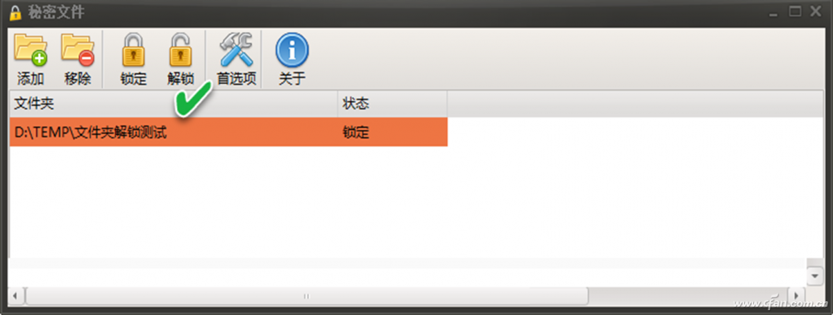 当需要加密文件夹时,单击“添加”按钮添加要保护的文件夹,也可以将文件夹拖放到软件窗口,首次加入的文件夹会自动锁定保护。这时,在资源管理器中已经可以看到,文件夹中的文件及其子文件夹已经被隐藏,父文件夹仍可见但已成为“空”文件夹。退出软件后,我们即便是开启系统的显示隐藏文件功能,也无法将这些文件显示出来。