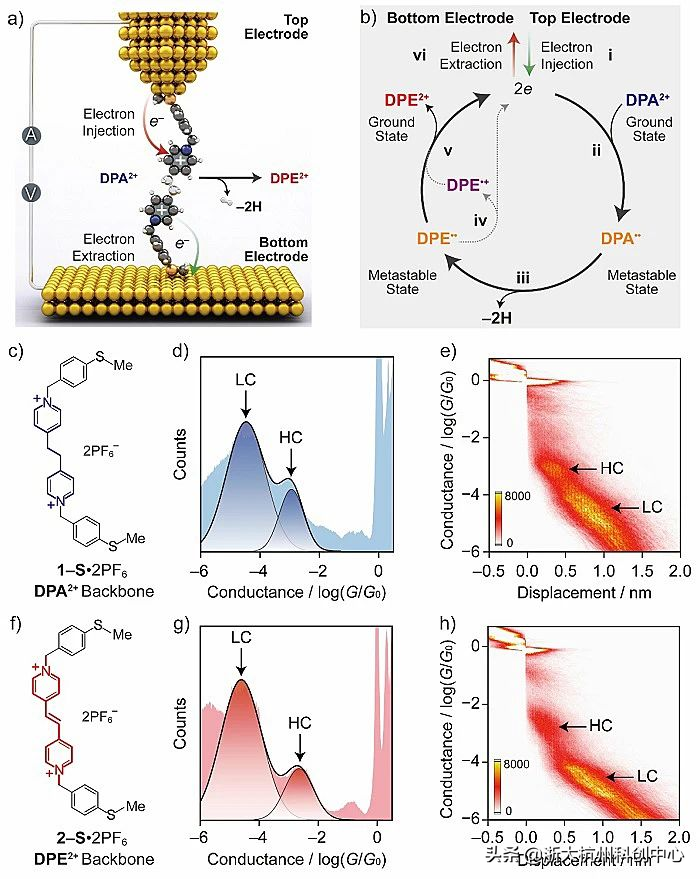 在进一步的工作中,陈洪亮研究团队发现:引入的电子可以作为自由基反应的有效催化剂,诱导脱氢反应的发生。正电荷的分子骨架在接收电极注入电子、发生氧化还原反应的过程中,产生了一个重要的副产品,它就是氢。他们首先描述了一种违反直觉的构效关系:饱和的双吡啶-乙烷(DPA2+) 骨架与共轭的双吡啶-乙烯(DPE2+) 骨架分子呈现出极为类似的电导特征 (图3)。为此,作者做出大胆假设:在分子结中发生了乙烷到乙烯的转化,造成了电导的提升。