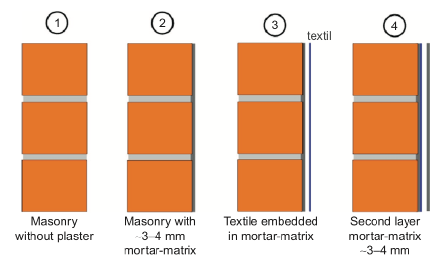为了增强纺织品与砂浆的粘结界面,必须在碱性环境(水泥砂浆)中对纺织品进行涂层处理。然后,使用砂浆化合物将纺织品应用于建筑结构。