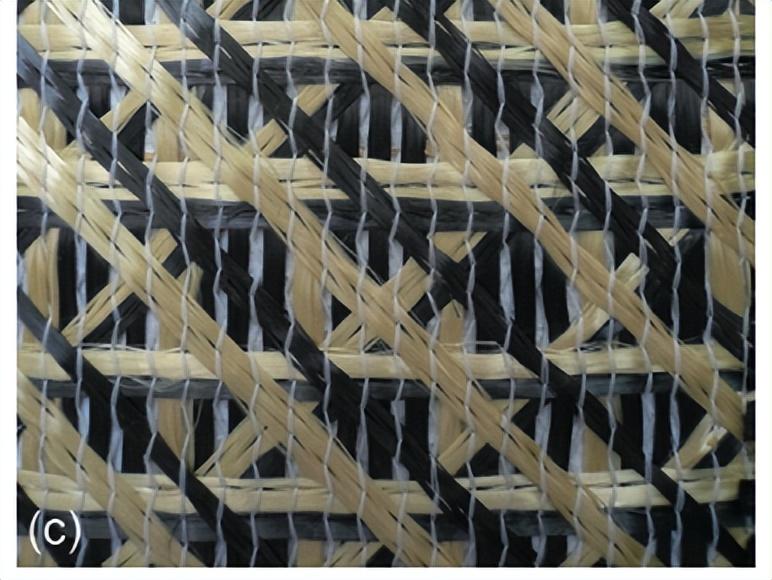 图1a是双轴结构,纬向为碳纤维,经向为玻璃纤维。图1b是三轴结构,纤维按±45°和90°排列。图1c是四轴混合织物,纤维方向为±45°/0°/90°,适合与流动性更高的树脂结合使用。