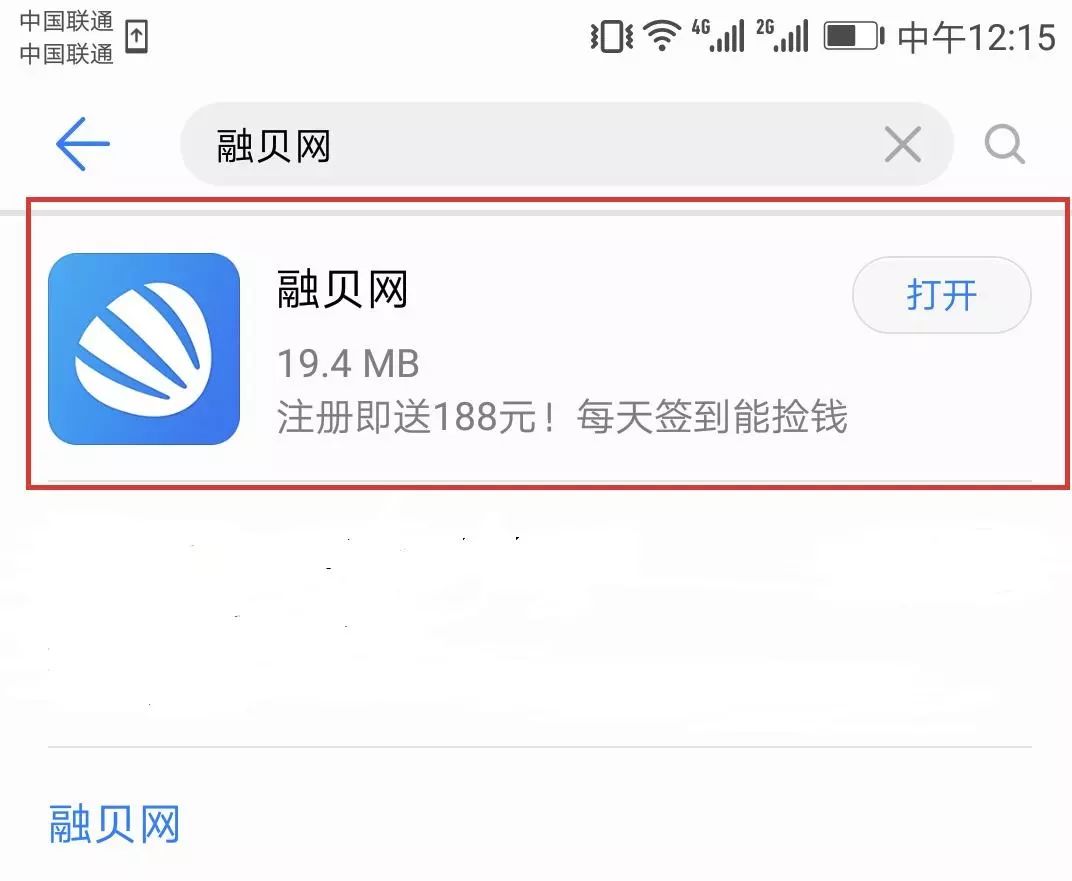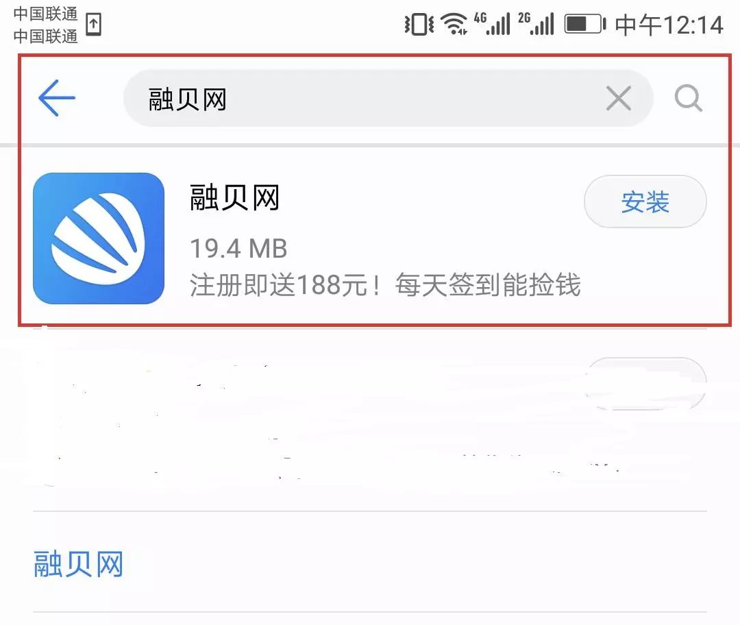 您看,是不是就出来了融贝网这个应用,然后点击右边的安装按钮,您看在一点点下载呢,进度条读完之后,原来的安装按钮就变成了打开按钮。