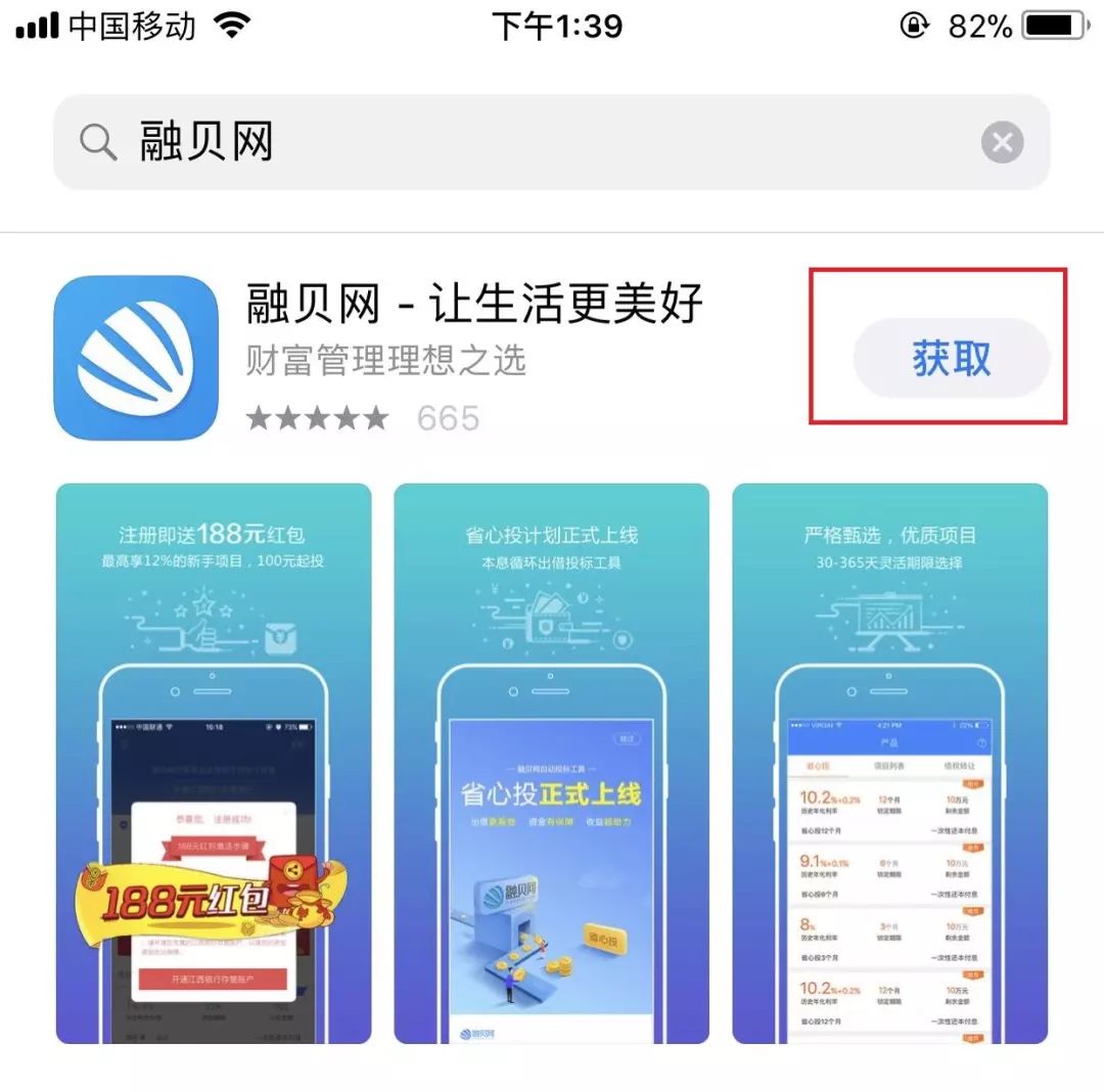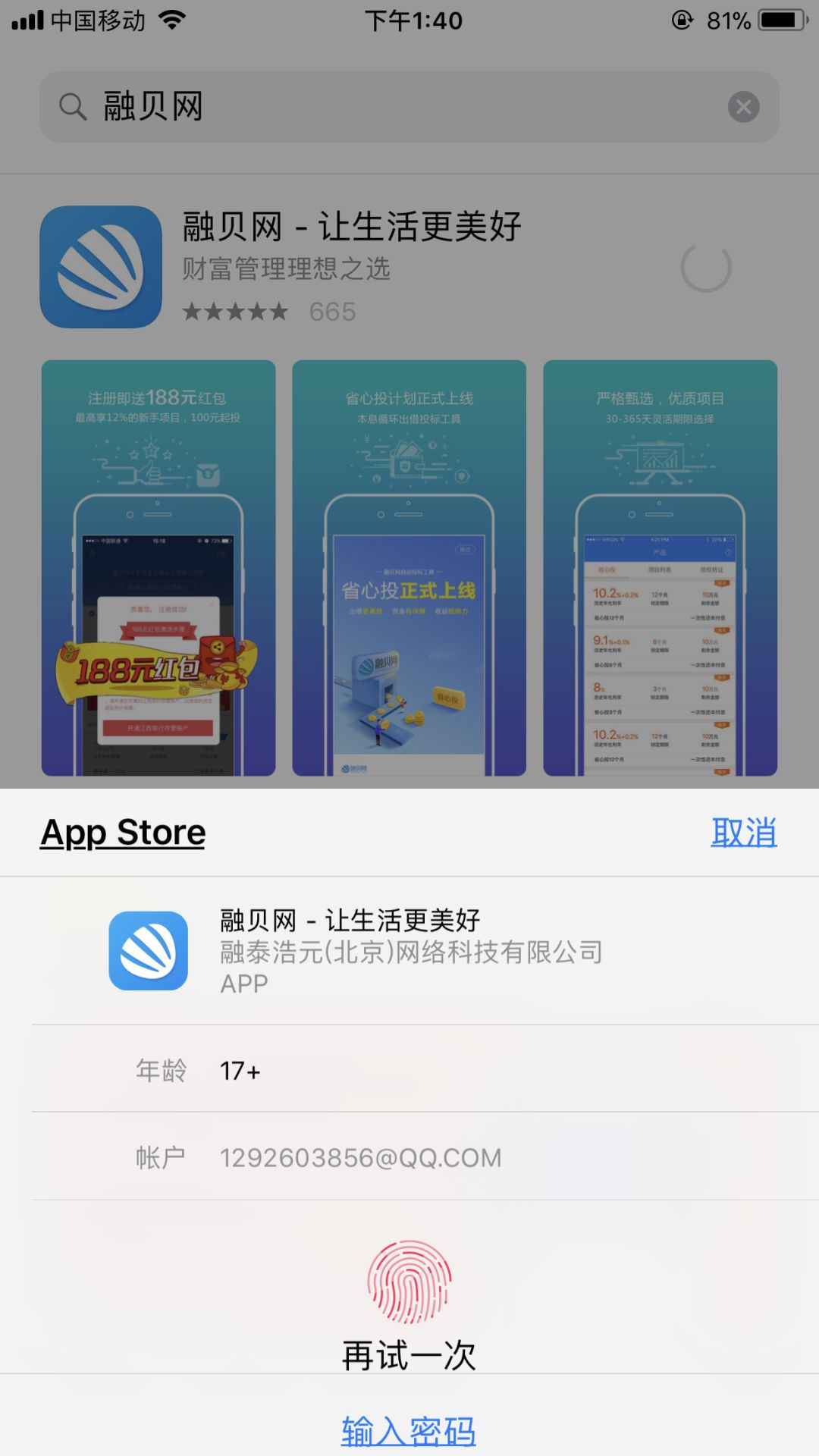 可以看到第一个就是融贝网,然后点击融贝网右边的获取按钮(假如您下载过的话,他就变成一朵云彩下边一个小箭头),点完之后出来一个让您确认密码,指纹或者是面部识别的一个对话框,如果是密码,您就输入密码,如果是指纹您就用解锁的手指轻轻放在home键上就可以了,不用按放上就行,如果是面部识别,您就像解锁手机一样对着自己的脸就可以了。