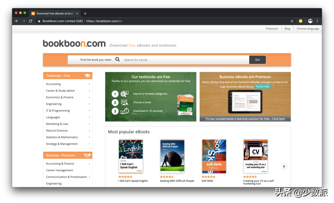 BookBoon 是一家专注收集整理电子版教科书 的网站。这里的电子书应有尽有,特别是教科书方面,其资源整理非常全面。总共 10 大类别的电子教科书,一定有我们想要的资源。同时,BookBoon 也提供完全免费的下载。官方称其免费的教科书以及付费的商业方向电子书资源每一年都有 7500 万的下载量。