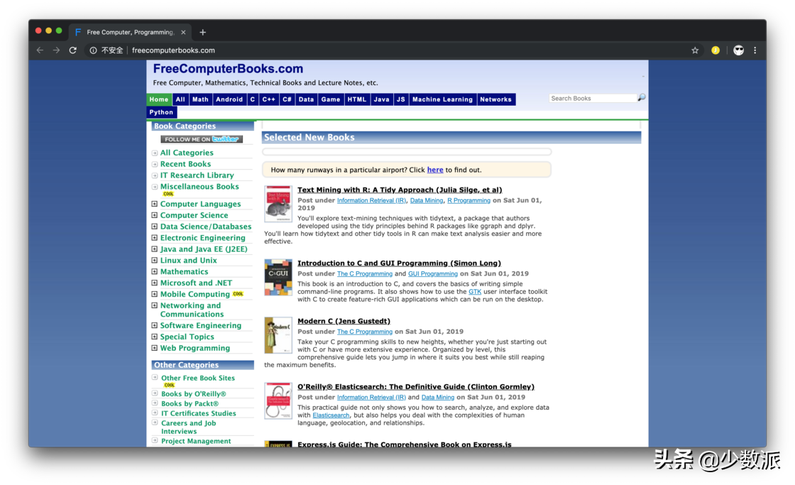 Free Computer Books 是一个有着相当年代感的网站,上面收录的全部都是和计算机相关的书籍。虽然看起来非常非常不靠谱,但是 Free Computer Books 上面的资源还是相当优质的。首页推荐的基本书籍都是 2019 年最新的版本,比如「Introduction to C and GUI Programming」这本书,就收录自树莓派方面提供的 C & GUI PROGRAMMING 教材。值得参考。