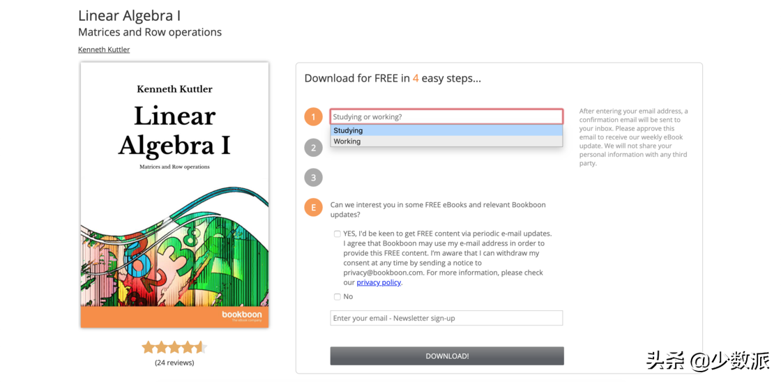 下载电子书的时候,BookBoon 不需要注册,只需要我们简单的回答几个问题:明确一下你的学历、专业状态以及提供一个(可选的)订阅邮箱,我们就可以立刻下载 BookBoon 上面的任意内容。非常方便快捷,良心项目。