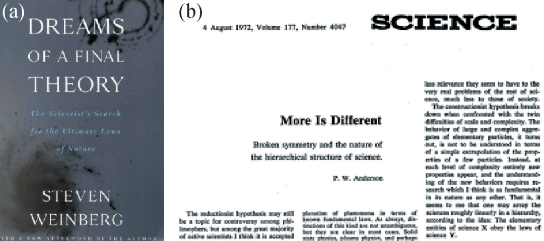图1 (a)温伯格的著作《终极理论之梦》阐述了“还原论”的观点;(b)安德森的名篇《多者异也》,阐述了“层展论”的观点