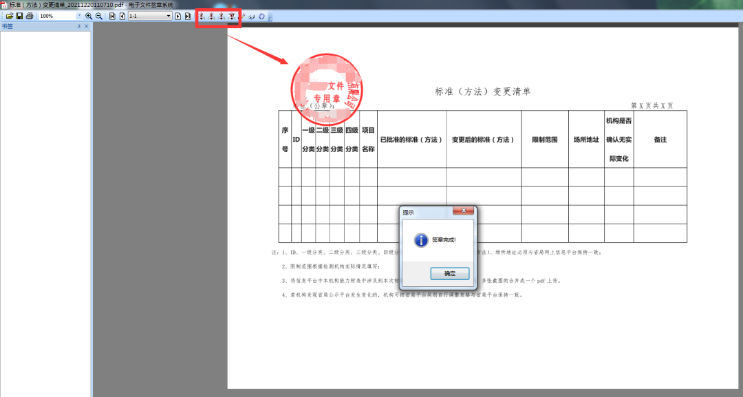 2、点击【打开】,选择填报完毕的【变更清单】,然后点击【电子签章】,将电子公章拖至需要盖章的位置,出现“签章完成”提示即可。