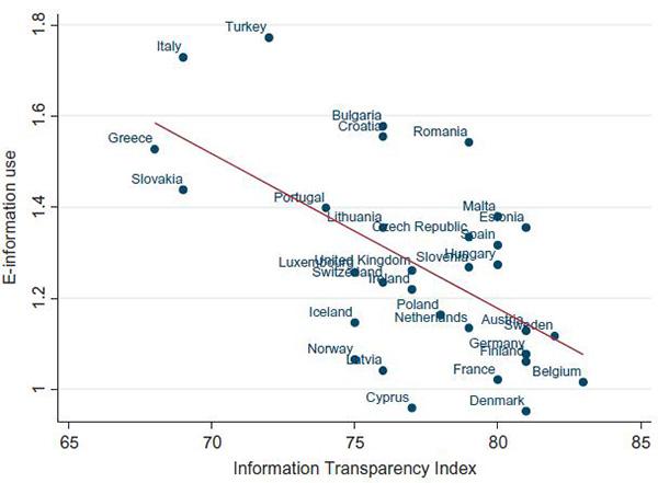 图1 信息透明指数与电子信息使用的散点图和线性拟合线