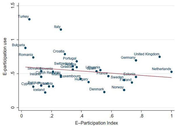 如图3所示,横轴是电子参与指数,取值越大意味着该国电子参与表现越好。纵轴是电子参与的使用情况,取值越大说明民众越频繁地登录政府网站去参政议政。图中圆点代表各个国家,可以看到国家的分布情况并不能反映电子参与绩效与公民使用之间存在明显的相关关系。