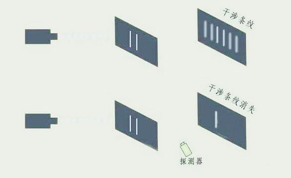 但是,这个观测装置一旦被放在了双缝后面,电子的波动性就消失了。它以粒子性的形式在后面的靶板上成像:干涉条纹消失。