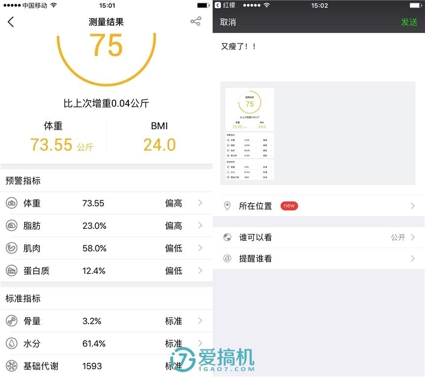 (左图为个人净体重,右图为手拿 iPhone 6s Plus 之后的体重)